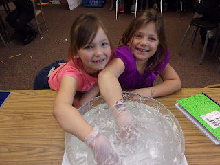 Learning About the Arctic - We learned that animals that live in the Arctic and Antarctic have blubber to keep them warm. We learned that blubber is fat. We thought we would try it out. We got a big bowl of ice cold water. First, we put our hands in the freezing water. Then, we covered our hands with Crisco lard and put them back in the freezing water. The kids said their hand wasn't as cold with the Crisco on it. Miss Howell helped the kids with this project. They wrote what they thought about it. Some of them are ready to go to the Arctic and wear a blubber suit.